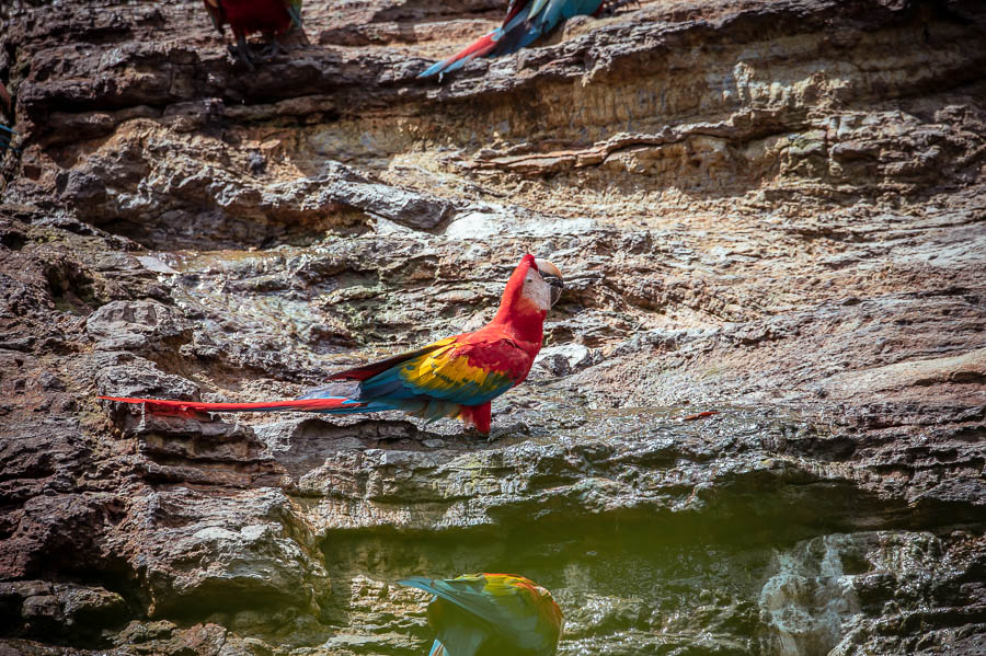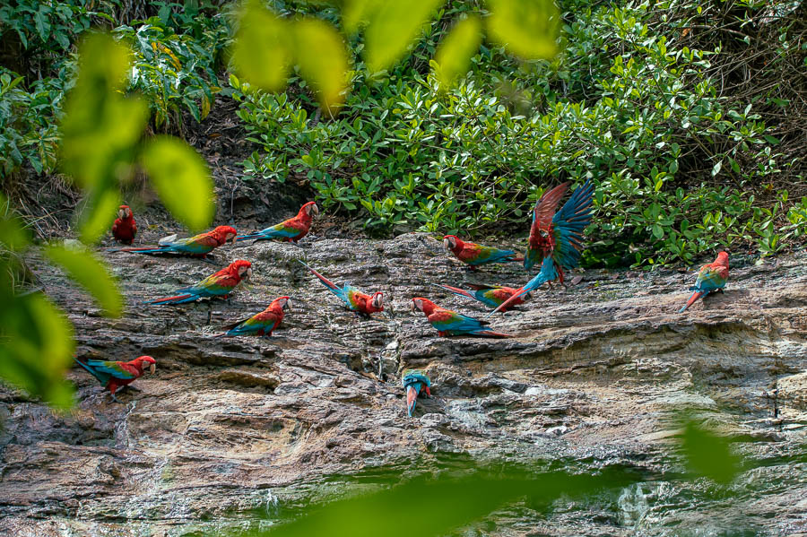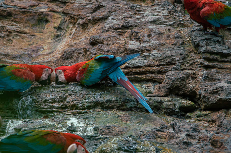 Der Platz war ganz ok, wir hockten auf morschen Holzbalken und hatten ein paar Palmenblätter überm Kopf und lagen dort erstmal erschöpft für gut 2 Stunden herum, ehe ein erstes Kreischen zu vernehmen war. Noch eine weitere halbe Stunde verging, ehe auf einmal unzählige Grünflügelaras einfielen und genüsslich die Mineralien aus dem Gestein aufnahmen. Soweit ich das richtig verstanden habe, hilft das bei der Verdauung. Das Spektakel dauerte etwa 90 Minuten und als die letzten weggeflogen sind, durften wir die Behausung verlassen.