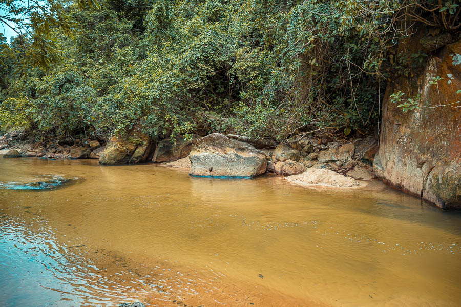 Und als ich dann wieder ins Wasser gehe und eben diese heißen Quellen aufspüre, ist es um mich geschehen. In schönster Natur mitten im Regenwald mit herrlichem Ausblick im Wasser sein und dabei die Position jederzeit so zu ändern, dass sowohl das kühlende Wasser als auch die wärmenden Quellen für eine fabelhafte Balance sorgen. Wahnsinn, das ist alle Reisestrapazen Wert gewesen. Ich bleibe von 12 Uhr mittags an bis zum Sonnenuntergang um kurz vor 18 Uhr einfach die ganze Zeit über im Wasser liegen und habe einen Bewegungsradius von etwa 2 Metern.