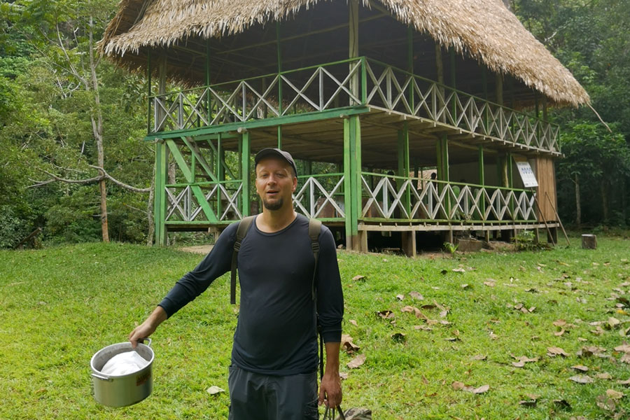Nach etwa 40 Minuten Fußmarsch kommen wir an eine kleine Lichtung mit einem realtiv großen Holzhaus, es besteht aus 2 Etagen samt Dach. Wir deponieren unsere Rucksäcke dort und der Guide will schnell weiter, warum diese Hektik, verstehe ich nicht ganz, aber ich bin ja immer bereit für alles und so waren es die anderen, auf die wir warten mussten.
