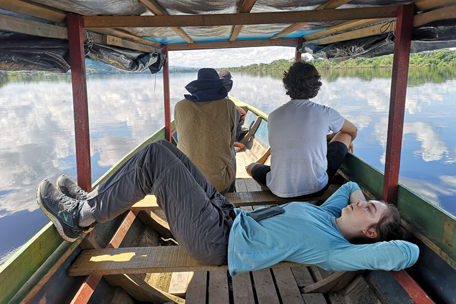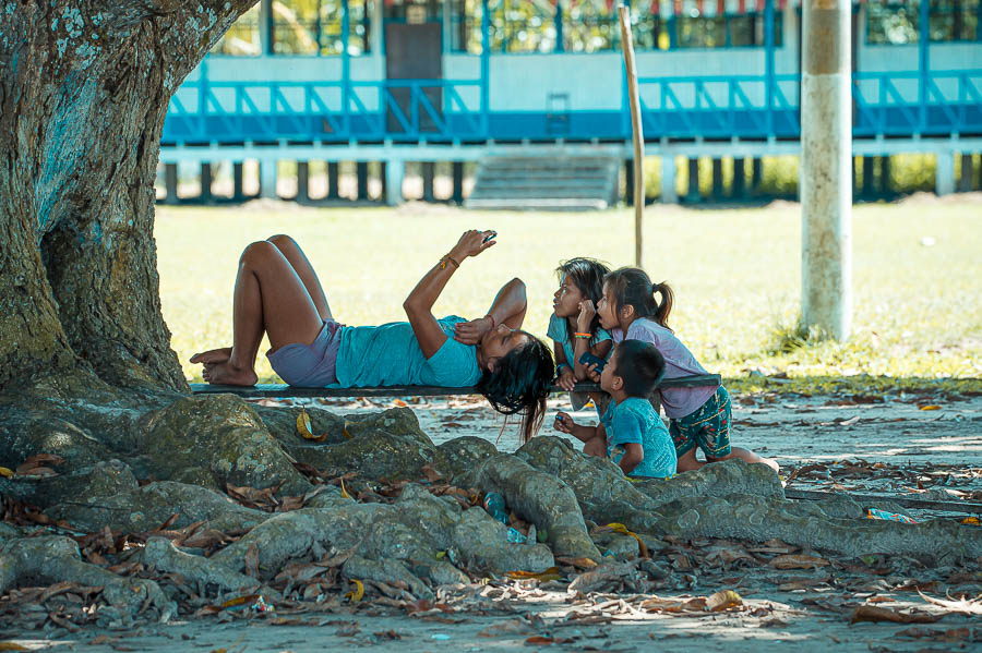 Schließlich wollen wir noch einmal an Land gehen, passieren ein indigenes Dorf und lassen uns an deren Feuerstelle mit Blick auf das Wasser nieder. Selten und weit entfernt erspähen wir ab und an Amazonas Delfine. Jedes Mal aufs Neue ist genau das etwas Surreales.